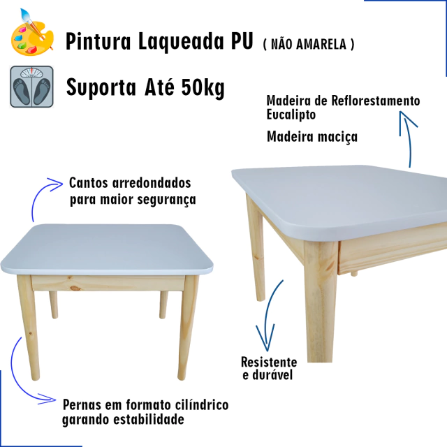 - Acabamento laqueado branco fosco com acabamento Lisa e pernas em cor Natural, somente verniz.