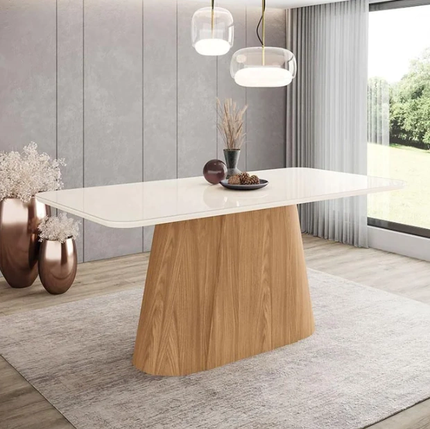 Mesa Olivia Henn 6 Lugares com Vidro e Canto Arredondado - Nature/Off White | Design Moderno e Sofisticado para sua Sala de Jantar